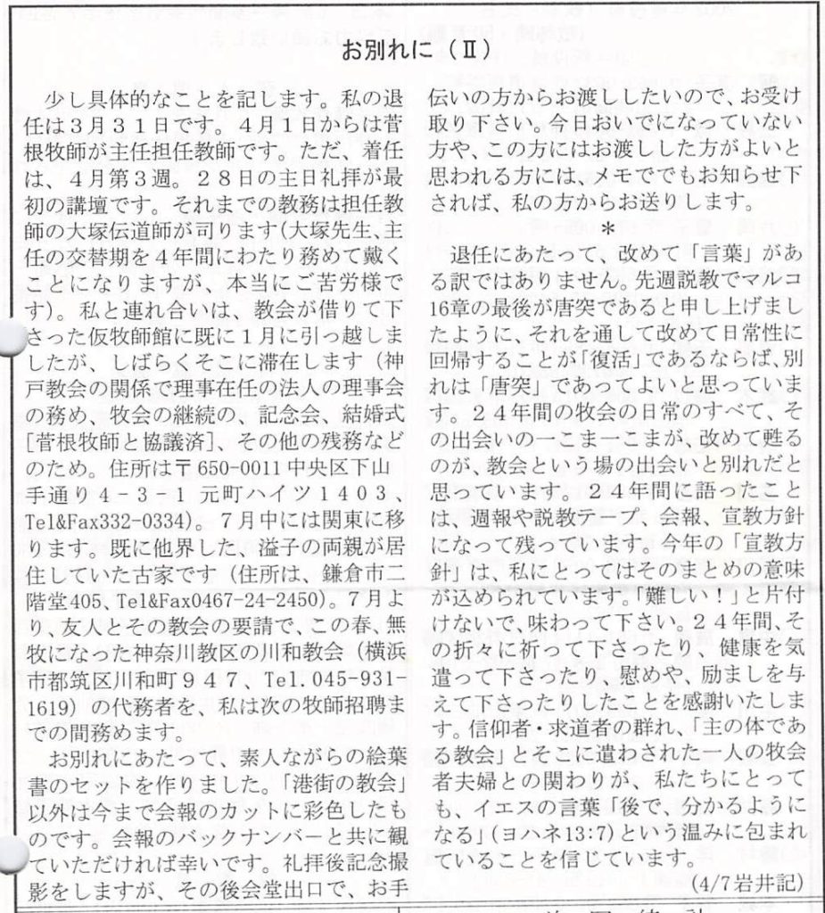 (神戸教会の関係で理事在任中法人の理事会の務め、牧会の継続の記念会、結婚式《菅根牧師と協議済み》、その他の残務のため)