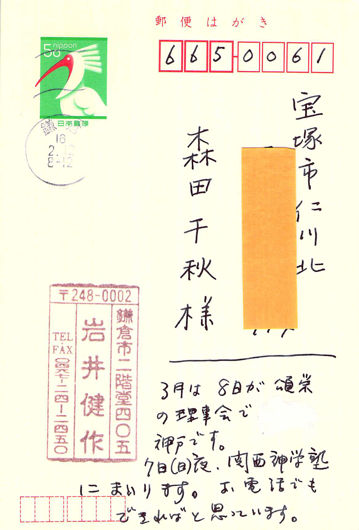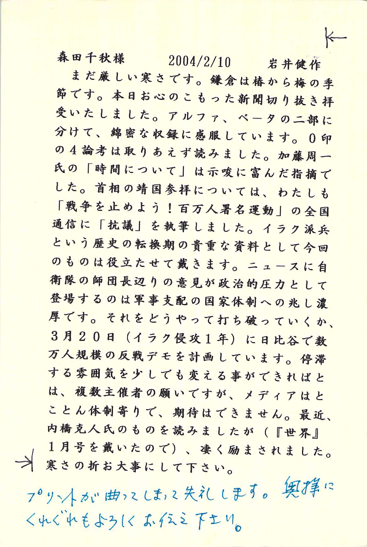 投稿日: 2004-02-102020-01-10 投稿者: 管理者書簡(2004 2月) 2004.2.10、森田千秋さん(神戸教会員)宛 (川和教会代務者牧師 2002.7-2004.3、健作さん70歳) 書簡インデックスに戻る 次のハガキ