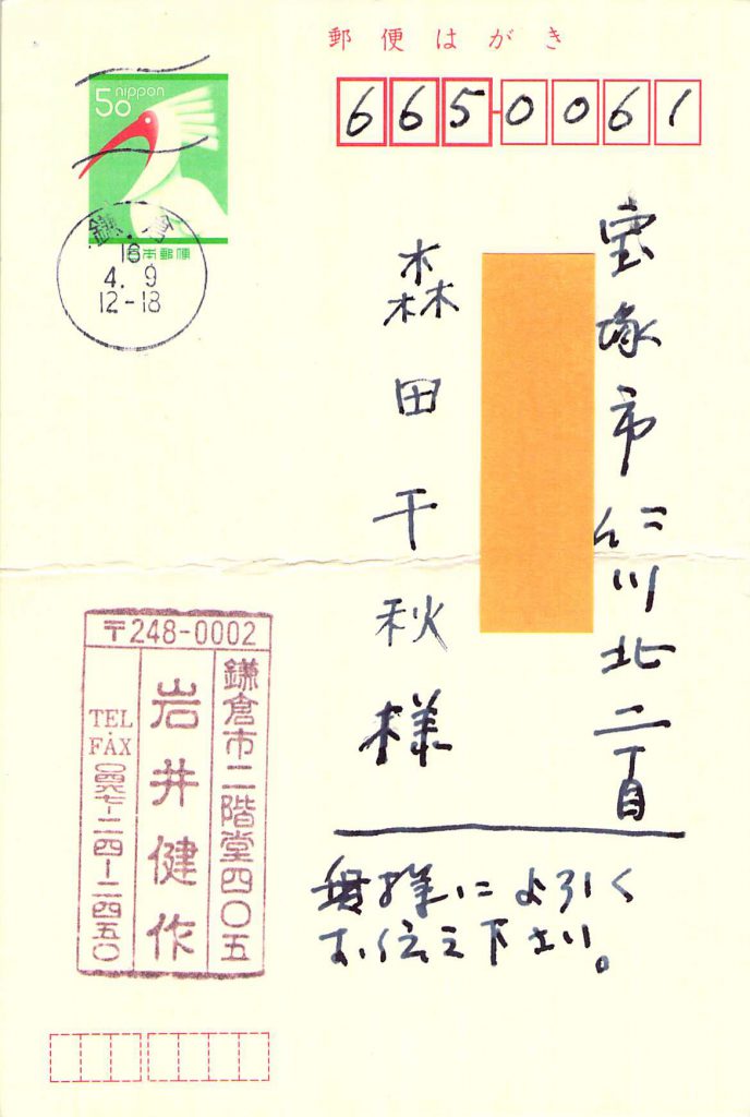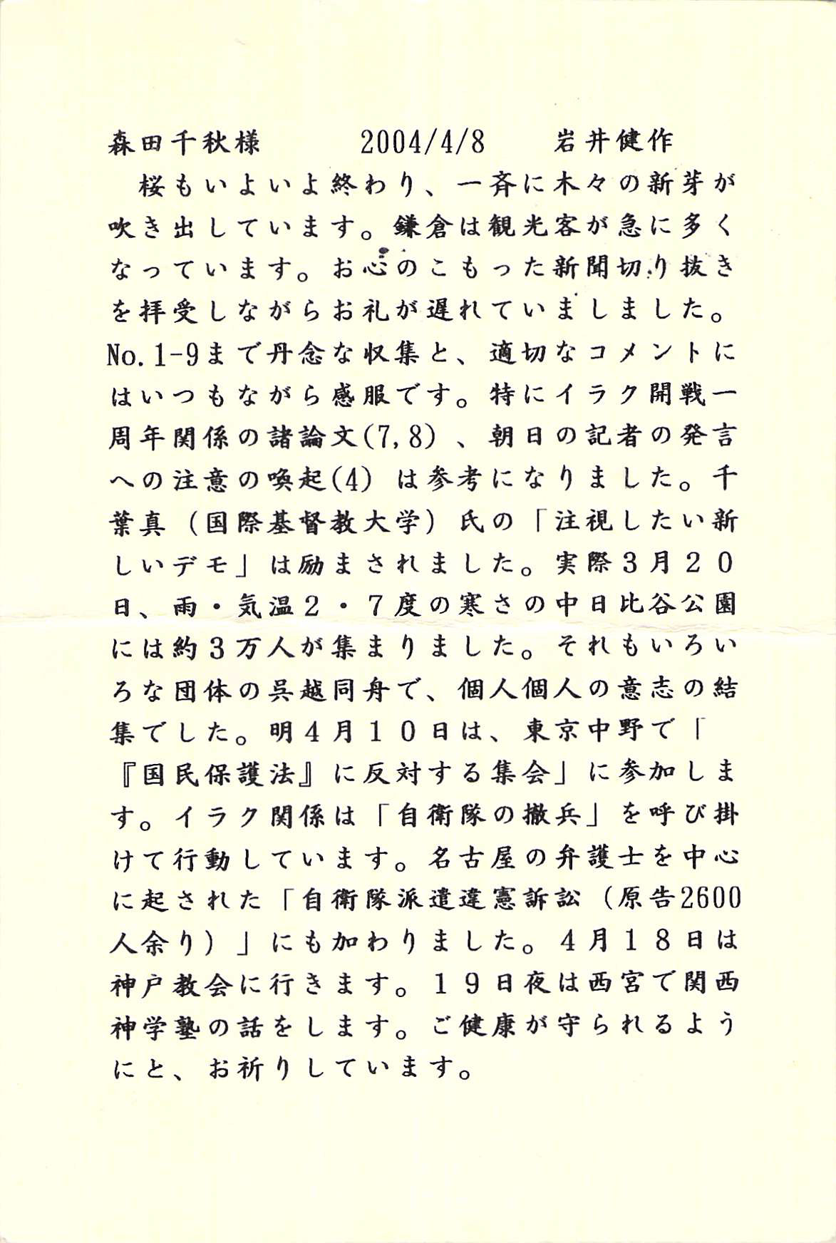投稿日: 2004-04-082020-01-22 投稿者: 管理者書簡(2004 4月) 2004.4.8、森田千秋さん(神戸教会員)宛 (前・川和教会代務者牧師 2002.7-2004.3、健作さん70歳) 書簡インデックスに戻る 次のハガキ