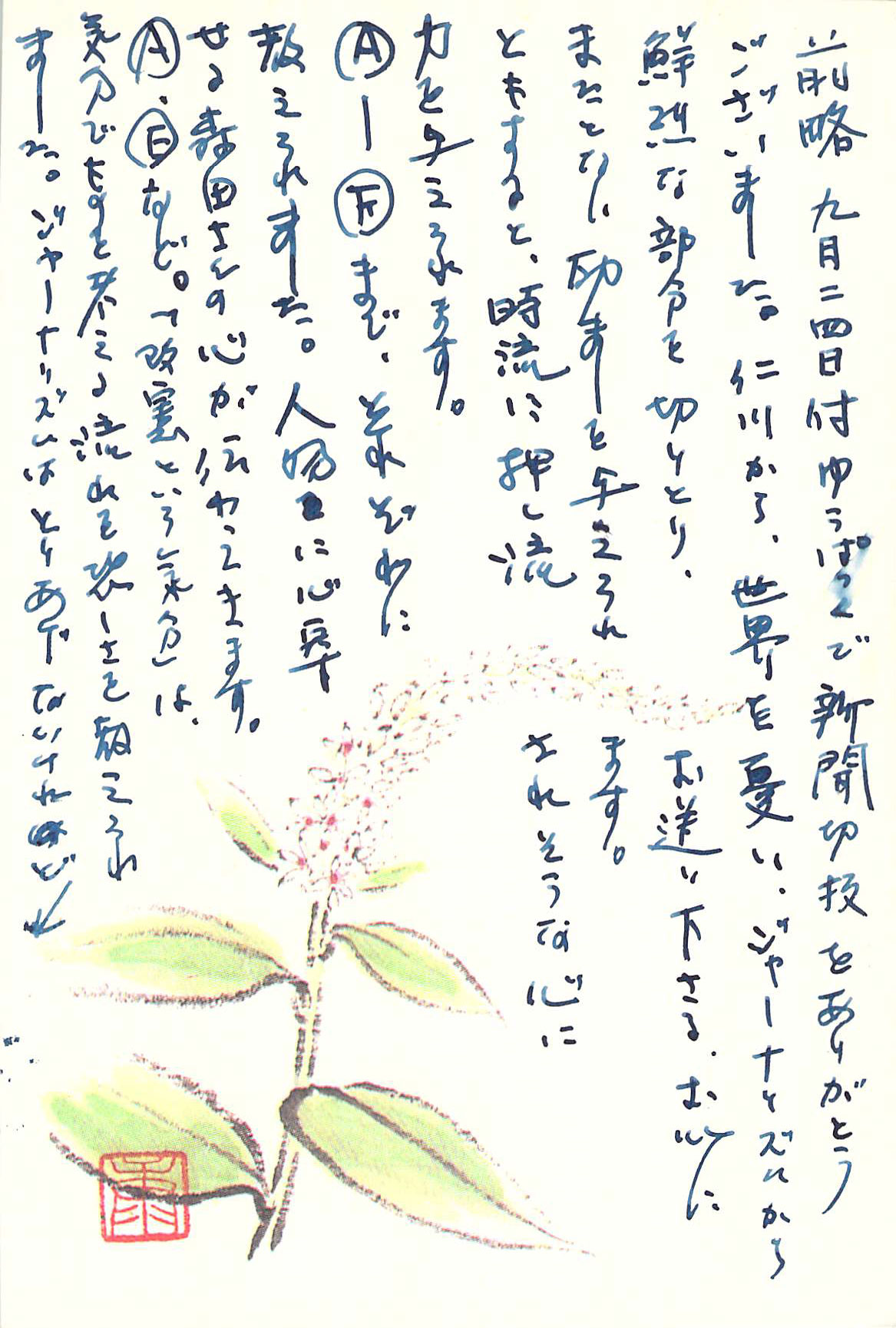 投稿日: 2004-09-302020-01-22 投稿者: 管理者書簡(2004 9月 ②) 2004.9.30、森田千秋さん(神戸教会員)宛 (前・川和教会代務者牧師 2002.7-2004.3、健作さん71歳) 書簡インデックスに戻る 次のハガキ