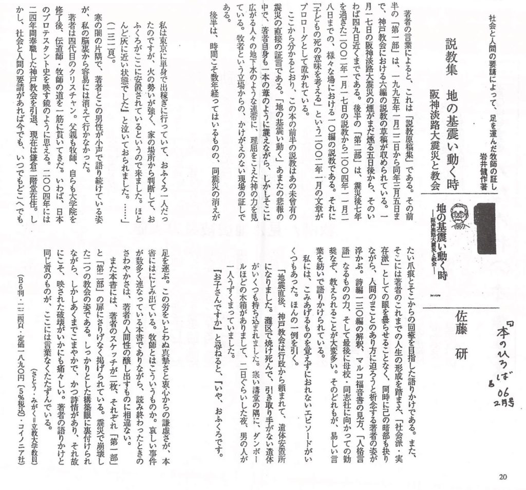 投稿日: 2006-02-012026-01-14 投稿者: 管理者史料:佐藤研. 書評『地の基震い動く時 – 阪神淡路大震災と教会』(2006) 「本のひろば」2006年2月号、キリスト教文書センター 『地の基震い動く時 – 阪神淡路大震災と教会』岩井健作(コイノニア社 2005年) BOX-2. 個人所蔵史料(書籍等) (サイト記)佐藤研氏からのお葉書は3通保管されています。
