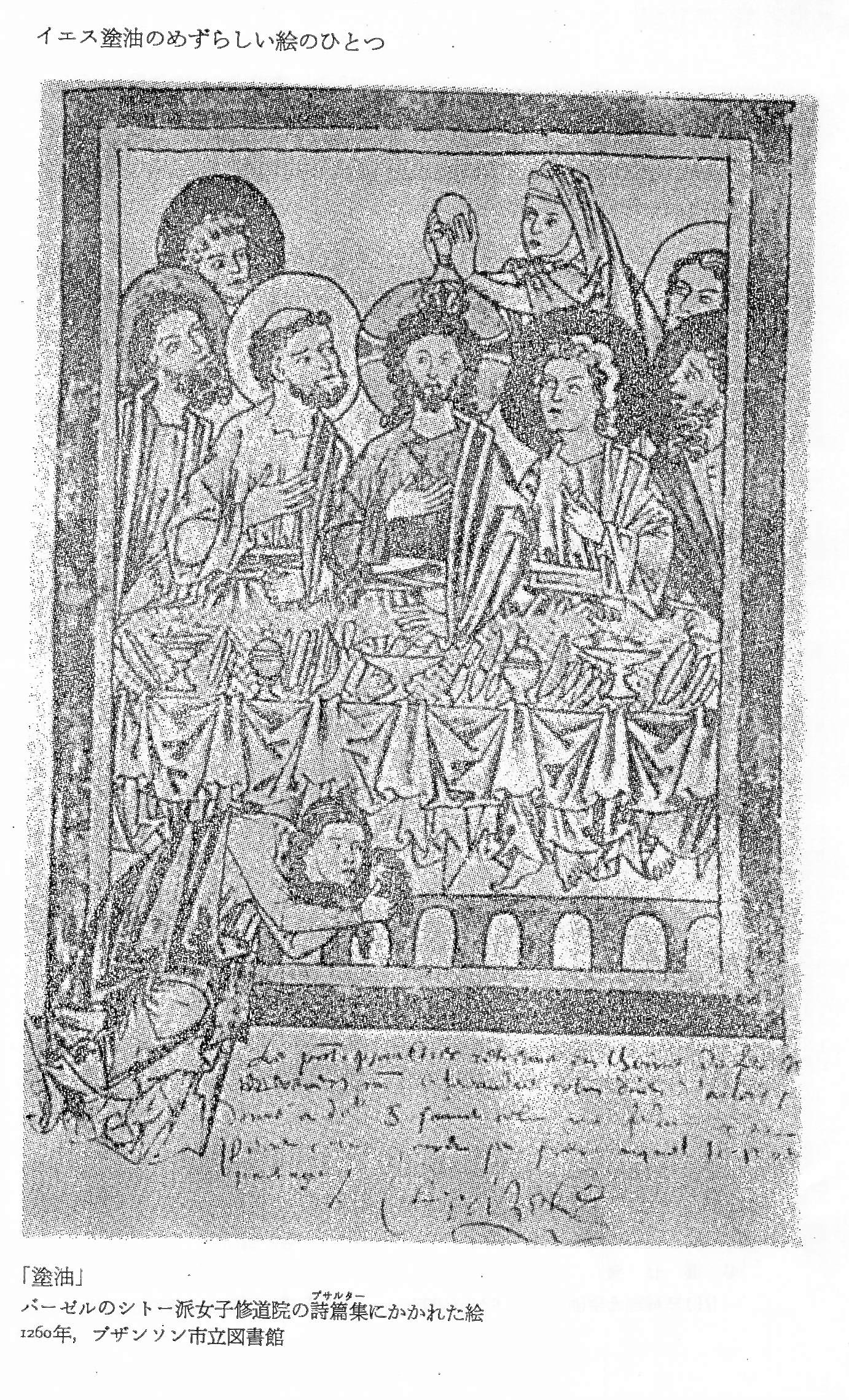 3.シトー派女子修道院の自立と自己感情に目覚め始めた修道女たちが描いた(描かせた)「イエスに塗油する女性」の図(裏面)は「頭」への「塗油」を強調しながら、ヨハネ的女性を描き込む。そうせざるを得ない時代的背景を伺わせる。