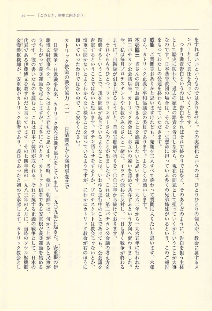 つまり戦責告白というのは、告白をすればそれで終わりではなく、その後どのように、告白を担う主体として歴史に関わり、過去の歴史の罪責を告白しながら、現在の問題として担っていくかということが大事なのです。日本基督教団の場合は、それを一生懸命に担っている多くの兄弟姉妹がいるという、このご報告をもって私の発題を終わらせていただきます。