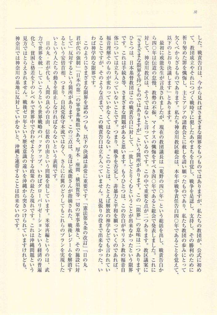 最初に戒能先生が言及されましたが、現在の教団議長は「荒野の40年」という総括を出し、戦責告白から40年は伝道の怠慢、強勢の不振、マイナスの懺悔をすべき40年であると総会で発表しました。これに対して、神奈川教区は、そうではないと言っているのです。この中で重要な点が二つあります。教区議案に「さまざまな限界を持つものではありますが」という箇所があります。この「限界」の意味は認めつつも、この「限界」の意味は二つあります。ひとつは、日本基督教団は、この戦責告白に対して、一致して取り組むということが出来なかったという限界です。これは手続き等、さまざまな問題があると思います。もうひとつは、この告白がキリスト教の福音自体については立ち入っていないことです。つまり、戦争を否定し、非暴力と平和を願っていくのであれば、福音理解そのものが変わっていかなくてはならない。このことは、例えば、解放の神学などでも言われていることですが、そのような点まで、この戦責告白は立ち入っていません。見張りの役まで出来なかった、いわば神学的な限界です。