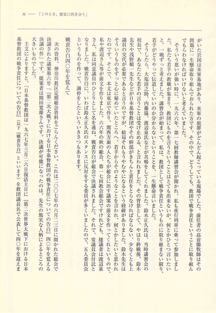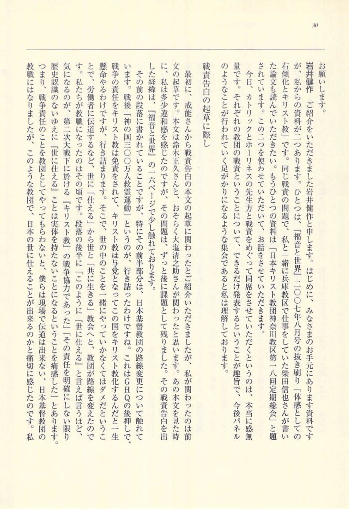 最初に、戒能さんから戦責告白の本文の起草に関わったとご紹介いただきましたが、私が関わったのは前文の起草です。本文は鈴木正久さんと、おそらく大塩清之助さんが関わったと思います。あの本文を見た時に、私は多少違和感を感じたのですが、その問題はずっと後に課題として残りました。その戦責告白を出した経緯は、「福音と世界」の16ページで少し触れております。