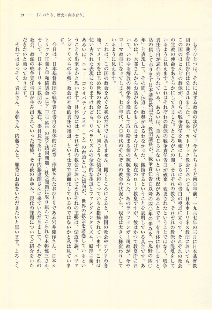 今日は、日本基督教団の戦争責任告白を具体的に起草・作成されたおひとりである岩井健作さん、日本カトリック正義と平和協議会(以下「正平協」)で長く靖国問題・社会問題に取り組んでこられた木邨健三さん、そして、日本ホーリネス教団の、現在、委員長であります内藤達朗さんに来ていただきまして、それぞれの教会、教派の戦争責任告白が生み出されていった経緯、その後のあゆみ、現代の課題についてご紹介をいただきたいと願っております。