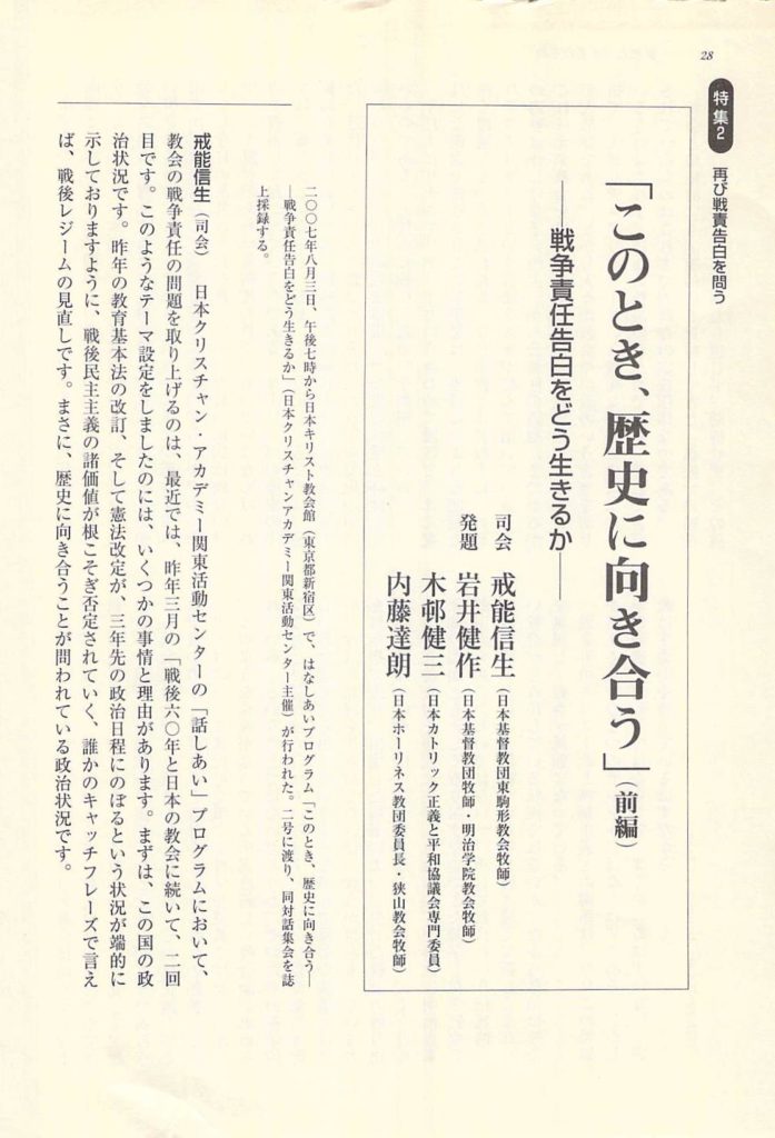 2007年8月3日、午後7時から日本キリスト教会館(東京都新宿区)で、はなしあいプログラム「このとき、歴史に向き合う- 戦争責任告白をどう生きるか」(日本クリスチャン・アカデミー関東活動センター主催)が行われた。二号に渡り、同対話集会を誌上載録する。