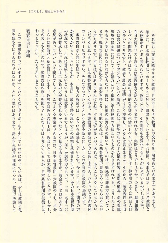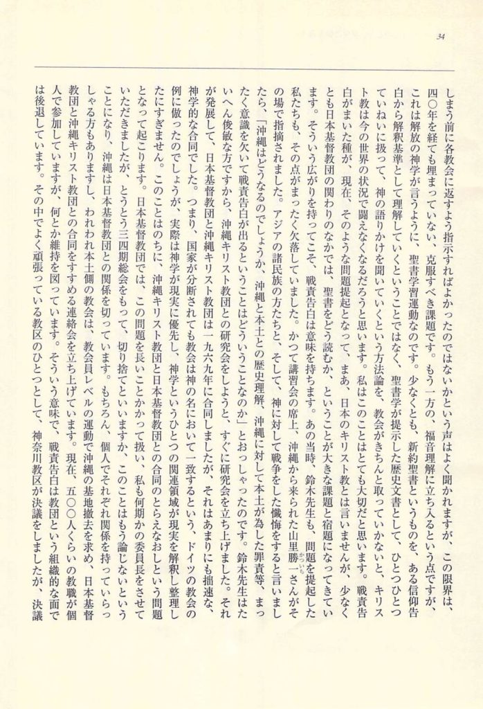 この「限界を持っていますが」というくだりですが、もう少し丁寧にやっていれば、少しは教団に亀裂を残さずにすんだのではないか、という思いはあります。鈴木正久議長が拙速にやった、教団で決議してしまう前に各教会に返すよう指示すればよかったのではないかという声はよく聞かれますが、この限界は、40年経ても埋まっていない、克服すべき課題です。もう一方の、福音理解に立ち入るという点ですが、これは解放の神学が言うように、聖書学習運動なのです。少なくとも、新約聖書というものを、ある信仰告白から解釈基準として理解して行くということではなく、聖書学が提示した歴史文書として、一つ一つ丁寧に扱って、神の語りかけを聞いていくという方法論を、教会がきちんと取っていかないと、キリスト教は今の世界の状況で闘えなくなるだろうと思います。私はこのことはとても大切だと思います。戦責告白が蒔いた種が、現在、そのような問題提起となって、まあ、日本のキリスト教とは言いませんが、少なくとも日本基督教団の関わりの中では、聖書をどう読むか、ということが大きな課題と宿題になってきています。そういう広がりを持ってこそ、戦責告白は意味を持ちます。あの当時、鈴木正久先生も、問題を提起した私たちも、その点が全く欠落していました。かつて講習会の席上、沖縄から来られた山里勝一さんがその場で指摘されました。アジアの諸民族の方たちと、そして、神に対して戦争をした懺悔をすると言いましたら、「沖縄はどうなるのでしょうか、沖縄と本土との歴史理解、沖縄に対して本土がなした罪責等、全く意識を欠いて戦責告白が出るということはどういうことなのか」とおっしゃったのです。鈴木先生はたいへん俊敏な方ですから、沖縄キリスト教団との研究会をしようと、すぐに研究会を立ち上げました。それが発展して、日本基督教団と沖縄キリスト教団は1969年に合同しましたが、それはあまりにも拙速な、神学的な合同でした。つまり、国家が分断されても教会は神の名において一致するという、ドイツの教会の例に倣ったのでしょうが、実際は神学が現実に優先し、神学という一つの関連領域が現実を解釈し整理したに過ぎません。このことは後に「沖縄キリスト教団と日本基督教団との合同のとらえなおし」という問題となって起こります。日本基督教団では、この問題を長いことかかって扱い、私も何期かの委員長をさせていただきましたが、とうとう34期総会をもって、切り捨てと言いますか、このことはもう論じないということになり、沖縄は日本基督教団との関係を切っています。もちろん、個人でそれぞれ関係を持っていらっしゃる方もありますし、我々本土側の教会は、教会員レベルの運動で「沖縄の基地撤去を求め、日本基督教団と沖縄キリスト教団との合同をすすめる連絡会」を立ち上げています。現在、500人くらいの教職が個人で参加していますが、なんとか維持を図っています。そういう意味で、戦責告白は教団という組織的な面では後退しています。その中でよく頑張っている教区の一つとして、神奈川教区が決議をしましたが、決議をすればいいというものではありません。その実質化というのは、一人ひとりの個人が、教会に属するメンバーとして責任を負っていくことです。