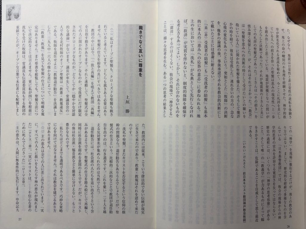 「未(非)受洗者の陪餐」も「受洗者の陪餐」も基本的に本人の「恵みへの応答の意志」に委ねられる。地上の生においては「洗礼」が礼典として先行しなければ「救済」が実質を伴わないと、制度的保障を確保する考え方もあってよい。しかし、それに合わないものを「粛清」するのはよくない。牧会の現場で「神学する」ことは、様々な思考を生む。ある一つの思考の結果としての「神学」を現場に敷衍するだけが、地上の教会のあり方ではない。まして、歴史的な経緯で多様なものを含んでいる「日本基督教団」では、牧会の現場からの神学的思考の営みを許容する寛容さを失ってはならない。歴史の過程には、いくつもの「神学の思考形態」があること、そして唯一の「教義学」が力あるものによって幅をきかすことは、危険であることを自戒として思う最近である。