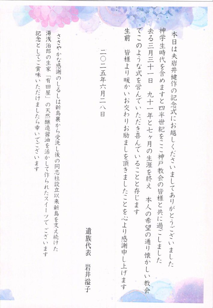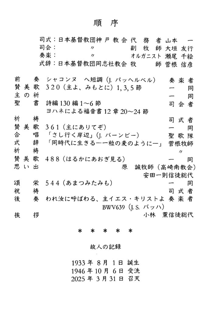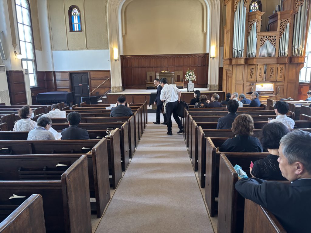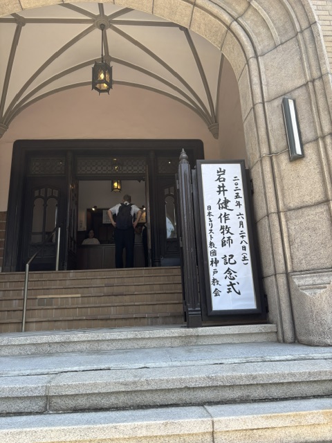投稿日: 2025-06-282026-01-24 投稿者: 管理者岩井健作牧師記念礼拝(2025) 2025年6月28日(土)午後1時半〜2時半神戸教会 一階満席170名。パイプオルガンのやさしい調べ(健作さんのお気に入りのストップ《音色》)、会衆讃美の力強い歌声が神戸教会会堂に響き渡った。 神戸教会会報 岩井健作牧師記念特別号「夫岩井健作を偲んで」(2025)