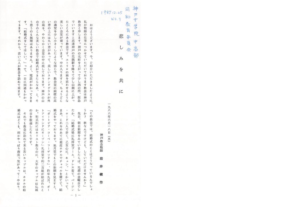 投稿日: 1986-06-182026-03-16悲しみを共に(1986 神戸女学院) 1986年6月18日(水)神戸女学院中高部 同和教育委員会冊子 No.9(p.1-p.15) 所収(1987年12月25日発行)(講演、テープ起こしから配布迄1年半。神戸女学院関係者に感謝) “悲しみを共に(1986 神戸女学院)” の続きを読む