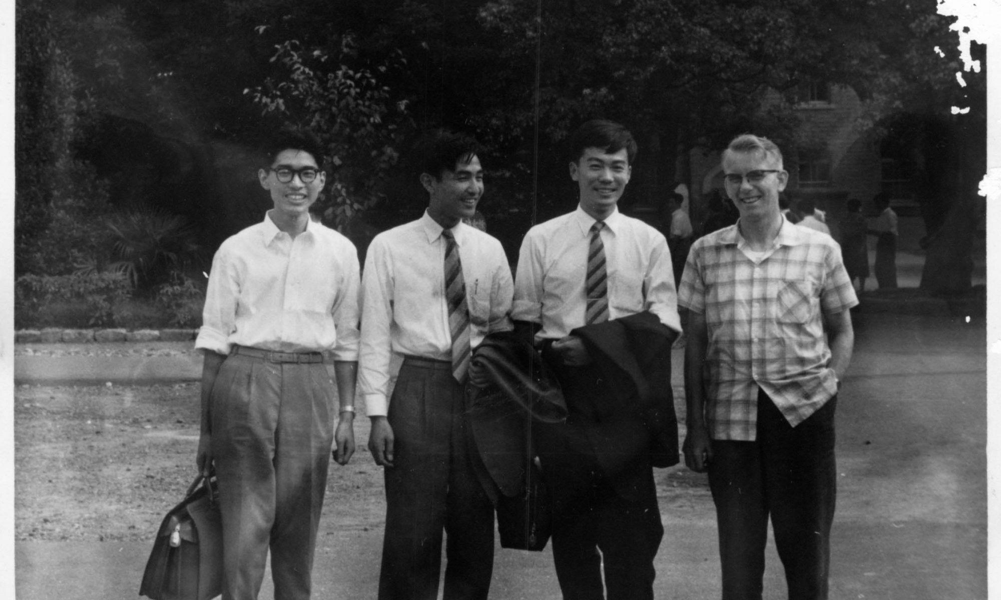 (サイト記)上の画像は野本真也さん所蔵:1960年夏、神学協議会、同志社大学神学館前にて。中央左が三好博(ひろむ)さん(河内松原教会牧師 28歳、後に浪花教会牧師)。左が健作さん(呉山手教会牧師 27歳)、中央右が野本真也さん(神戸教会伝道師 24歳、後に同志社大学神学部教授ー旧約聖書学、神学部長、賀茂教会牧師)